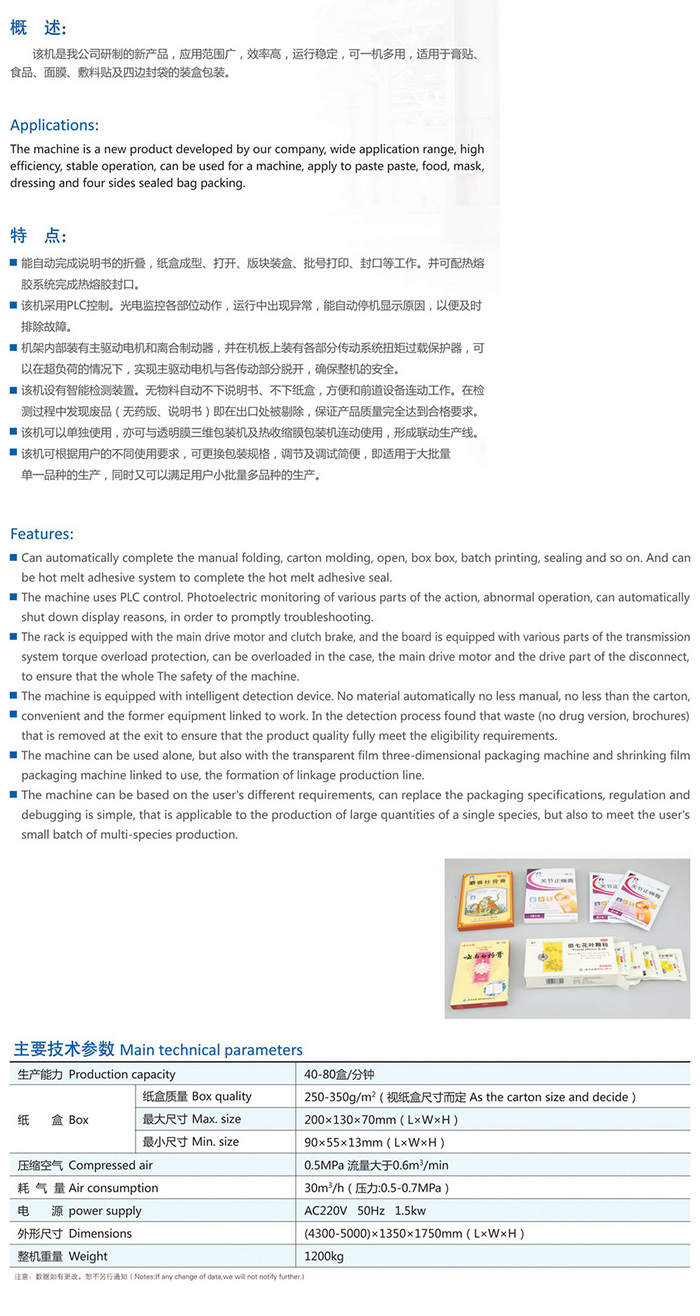 1.能自動完成說明書的折疊,紙盒成型、打開、版塊裝盒、批號打印、封口等工作.并可配熱熔膠系統(tǒng)完成熱熔膠封口。