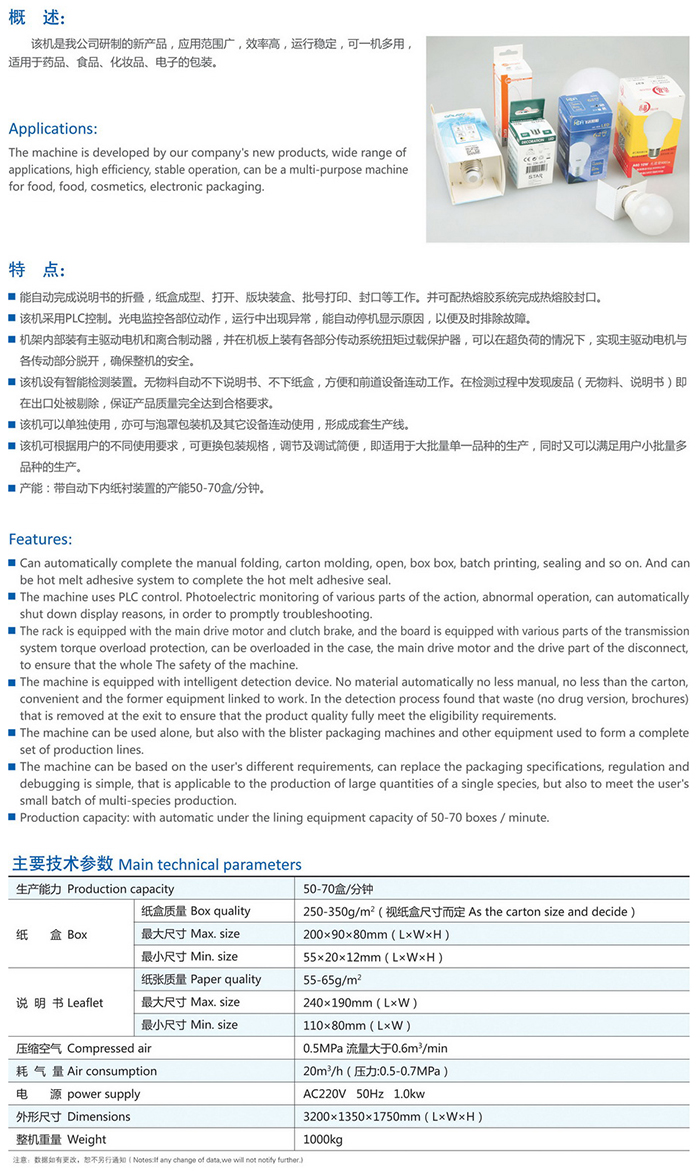 該機(jī)是我公司研制的新產(chǎn)品,應(yīng)用范圍廣。效率高。運(yùn)行穩(wěn)定,可一機(jī)多用適用于藥品、食品、化位品、電子的包裝。
