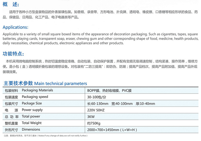 GBZ-130B透明膜三維自動包裝機適用于各種小方型盒裝物品的外表裝璜包裝.如香煙、錄音帶、方形電池、撲克牌、透明皂、橡皮擦、口香糖等相應形狀的食品、藥品、保健品、日用品、化工產(chǎn)品、電子電器類等產(chǎn)品。