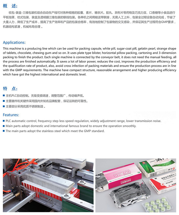 枕包一裝盒一三維包裝習(xí)U沮臺(tái)自動(dòng)生產(chǎn)線可對(duì)各種規(guī)格的膠級(jí)、素片、糖衣片。膠丸、異形片等藥物及巧克力豆、口香糖等小食品進(jìn)行平板泡罩、枕式包裝、裝盒及透明膜三維包裝的聯(lián)線包裝。各單機(jī)之間用輸送帶聯(lián)接,無(wú)需人工上料,包裝全過(guò)程設(shè)備自動(dòng)完成,節(jié)省了大量人力.降低了生產(chǎn)成本,提高了生產(chǎn)效率和產(chǎn)品的包裝合格率,有效地控制了包裝物的交叉感染,并保證其生產(chǎn)過(guò)程符合GMP要求,機(jī)器結(jié)構(gòu)緊湊,機(jī)械布局合理,具有國(guó)際國(guó)內(nèi)先進(jìn)水平。