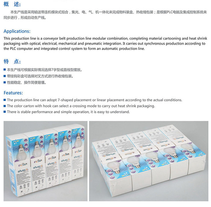 本生產線是采用輸送帶連機模塊式組合,集光、電、氣、機一體化來完成物料裝盒、熱收縮包裝;是根據PLC電腦及集成控制系統(tǒng)來同步進行,形成自動生產線。